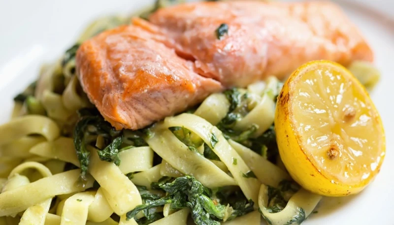 4° Servez les pâtes au saumon et épinards, puis disposez le saumon doré au centre du plat.