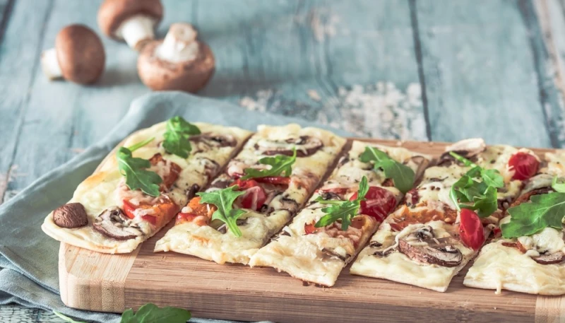 8° Servez immédiatement votre tarte flambée végétarienne chaude, parfaite pour un repas convivial et gourmand.