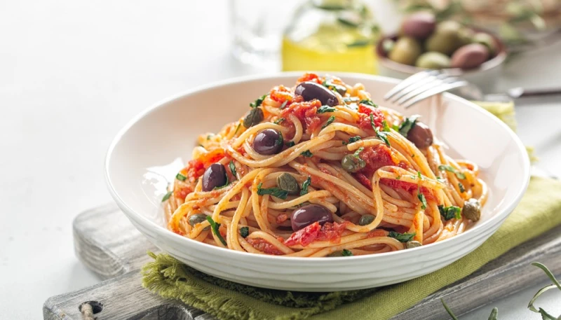 5° Mélangez bien et servez immédiatement les pâtes à la sauce puttanesca.