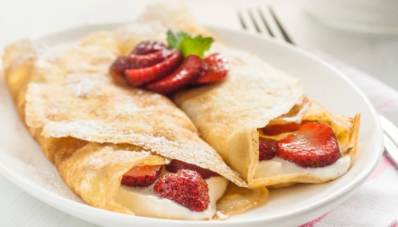 4° Étalez une couche de mascarpone sur chaque crêpe, ajoutez les fraises coupées, puis roulez ou pliez-les.
