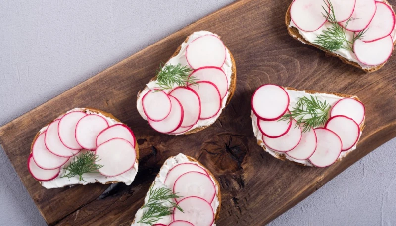 3° Répartissez les rondelles de radis de manière harmonieuse sur les tartines.