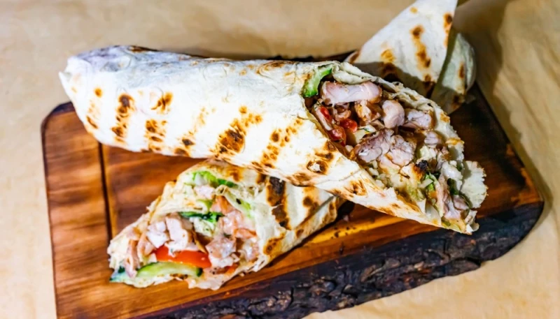 6° Étalez les tortillas sur votre plan de travail. Tartinez le centre de sauce, disposez la laitue, les lamelles de poulet, les crudités, puis refermez le wrap en repliant les côtés et en roulant fermement.