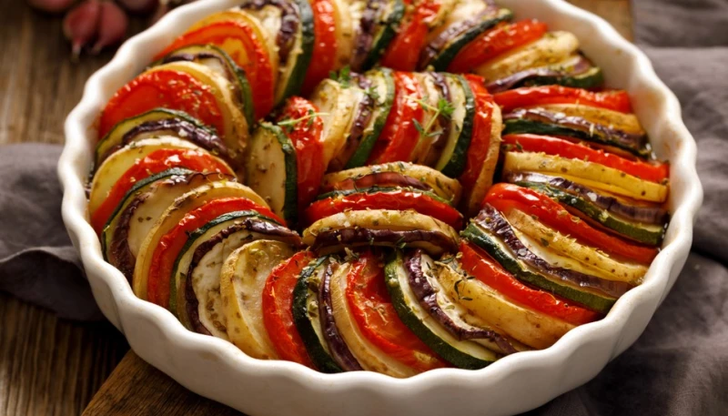 5° Disposez les rondelles de légumes debout en alternant les couleurs (ex. : tomate, courgette, aubergine, pomme de terre, oignon) pour un effet visuel harmonieux.