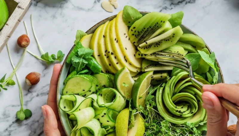 7° Répartissez harmonieusement les tranches de fruits, les lamelles d’avocat, les rubans de concombre et les tranches de courgette dans les bols.