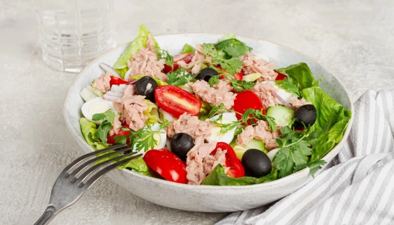 2° Répartissez harmonieusement les morceaux de thon égouttés sur la salade.
