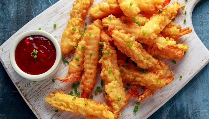 4° Trempez chaque crevette dans la pâte à tempura en tenant la queue, puis plongez-la directement dans l’huile chaude.