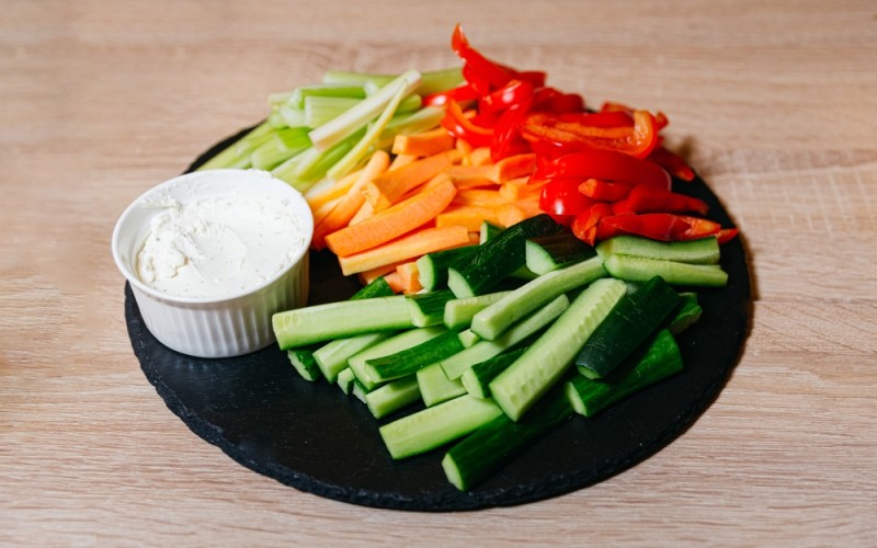 3° Taillez le concombre, le poivron rouge et le céleri en bâtonnets également.