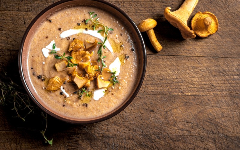8° Servez bien chaud, décoré de quelques champignons sautés, un filet de crème et un brin de thym frais.