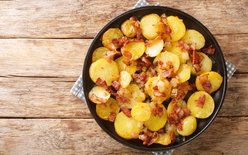 6° Incorporez les rondelles de pommes de terre. Salez légèrement (les lardons étant déjà salés) et poivrez à votre convenance.