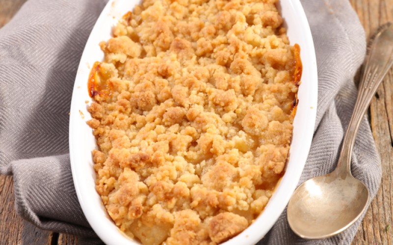 6° Recouvrez les fruits avec la pâte à crumble de manière uniforme.