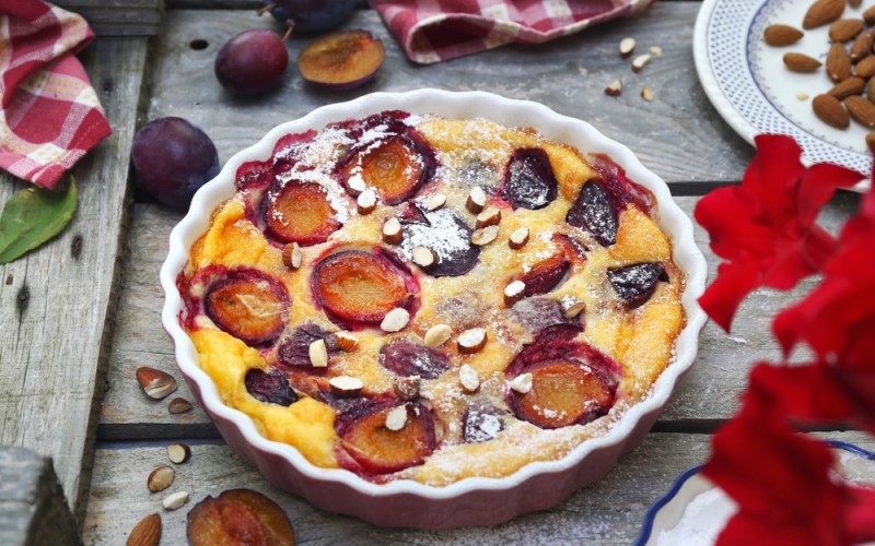 8° Faites cuire au four à 180°C pendant 35 à 40 minutes, jusqu’à ce que le clafoutis soit bien doré.