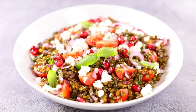 4° Dans un saladier, mélangez les lentilles, les tomates cerises coupées en deux, le fromage de chèvre émietté, l'oignon émincé et la grenade égrainée.