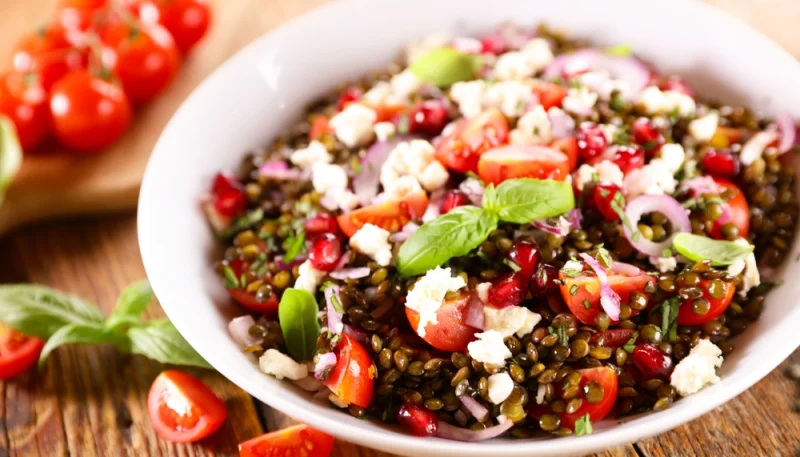 5° Dans un saladier, mélanger les lentilles refroidies, les tomates cerises, la feta et le persil.
