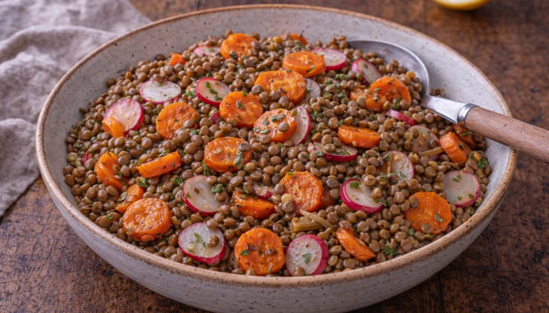 La salade tiède de lentilles aux légumes rôtis est une recette idéale pour apporter saveur et nutriments à votre table. Riche en fibres et en protéines, elle se compose de lentilles vertes fondantes mariées à des carottes tendres rôties au four et à des radis croquants. Un assaisonnement à base de citron, de moutarde et d'huile d'olive vient rehausser le tout, offrant une explosion gustative. Facile et rapide à préparer, ce plat convient parfaitement aux repas quotidiens comme aux occasions spéciales, tout en restant économique.