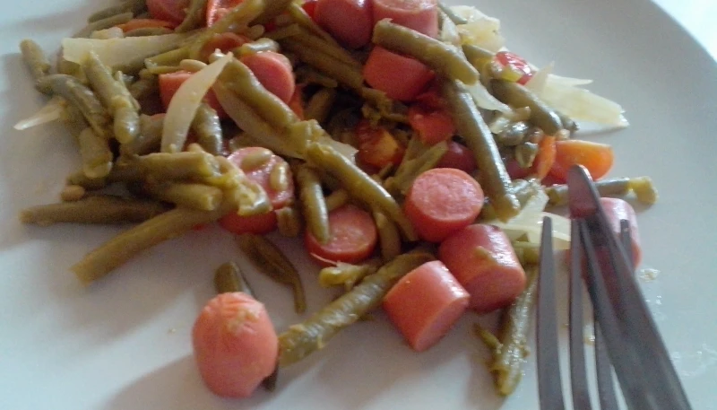 Faire revenir les oignon dans une noix de beurre, dans une poêle. Ajouter les tomates cerises puis les haricots en boite et enfin les knacks couper en morceaux. Faire sauter et cuire pendant 5minutes environ et c'est prêt ! Salez, poivrez et dégustez !