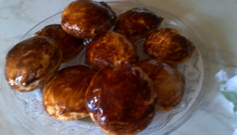 Badigeonner de jaunes d'oeuf le contour et refermer avec un deuxième cercle de pâte par dessus. Badigeonner le tout de jaune d'oeuf.