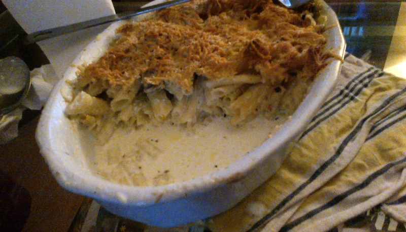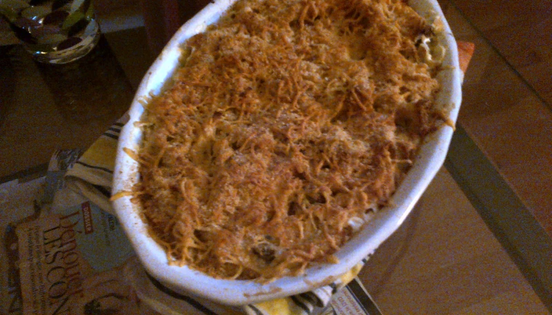 Verser le mélange dans le plat. Ajoutez au dessus un peu de fromage râpé (et de la chapelure si vous en avez pour donner un peu de croustillant).