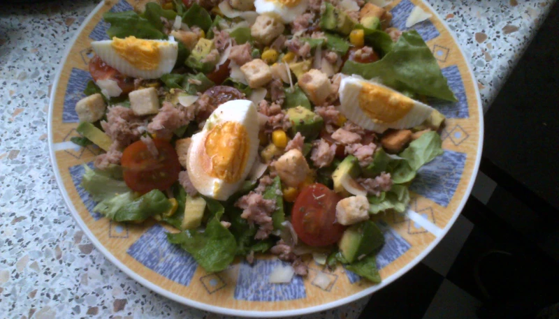 Prendre des feuilles de salades, les disposer dans une assiette, ajouter les ingrédients par dessus et un œuf dur (faire cuire dans une casserole d'eau, 10min a partir de l'ébullition) coupé en 4.