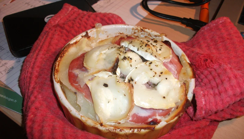 Enfournez 40 minutes à 190°C, chaleur en haut en bas, et surveillez de temps en temps. Il faut que ça grille et que les patates soient bien cuites.