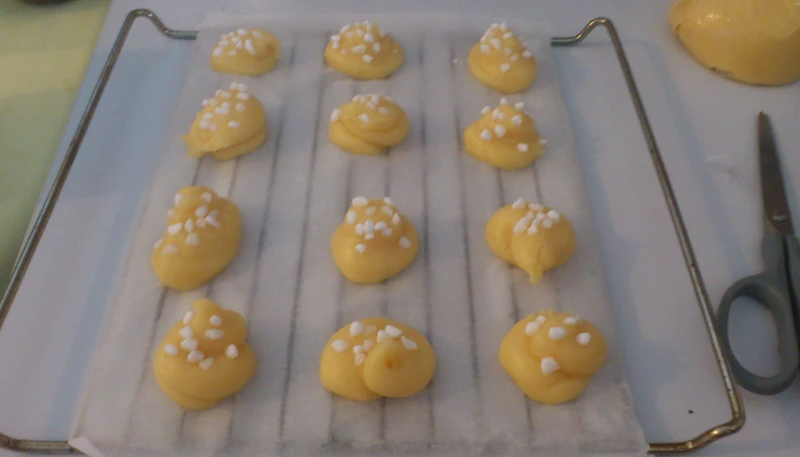 Déposer des petites boules de pâte sur une grille recouverte de papier sulfurisé grâce au sac congélation rempli de pâte et coupé dans un coin (poche à douille maison)