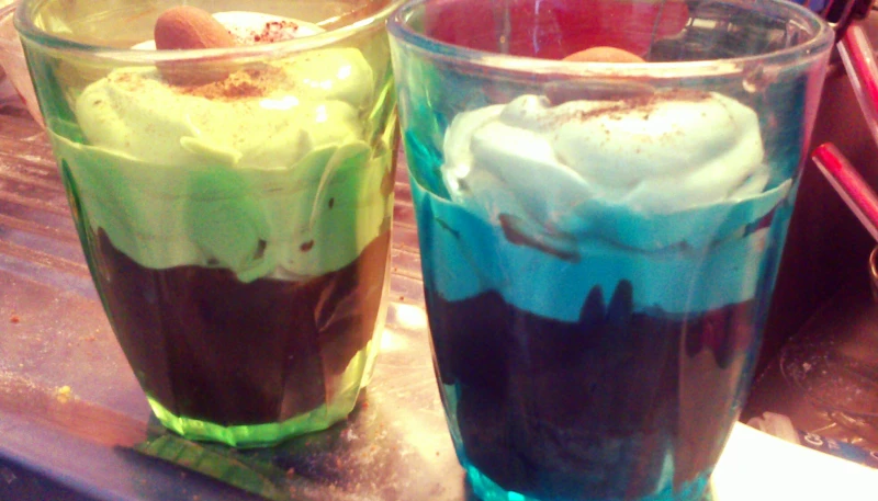 2. Faire fondre au micro onde 1/4 de tablette de chocolat noir avec de la crème fraiche. Attendre que le mélange refroidisse et verser dans les verrines.