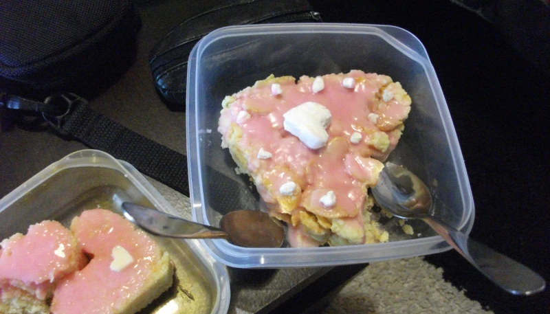Pour le glaçage rose : mélanger au fond d'un verre le sirop et le sucre glace, puis déposer sur la préparation refroidi, décorer avec le chamalow coupé en morceaux puis mettre au frigo au moins 1h.