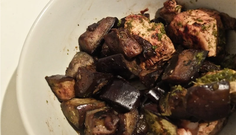 Emincer l'oignon et l'ail, faire revenir dans l'huile à feu moyen. Ajouter les aubergines coupées en dés et le miso, réduire le feu si nécessaire.