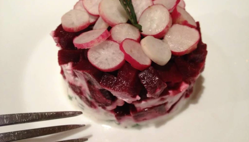 A l’aide d’un emporte pièce, monter les tartares en commençant par le chèvre, puis les betteraves, le chèvre, de nouveau les betteraves, puis les radis dispersés en rosace.