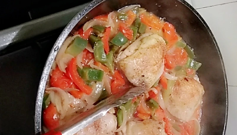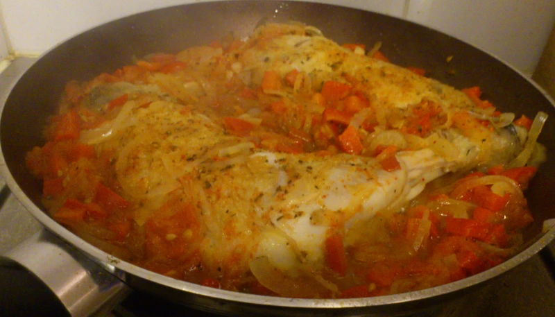 • Lorsqu'il est bien doré, ajouter l'oignon et l'ail émincés, la tomate et le poivron en dés