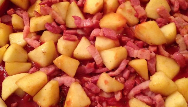 4. Versez les pommes dans la poêle avec les lardons et mélangez bien.