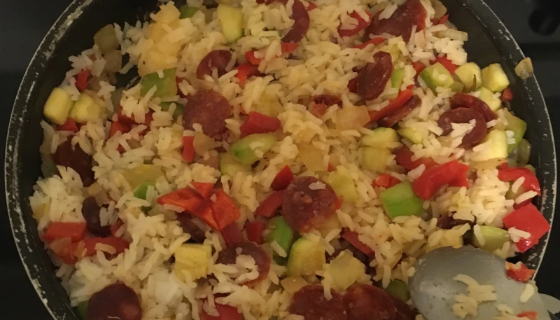 Ajouter le riz cuit à la préparation de légumes ainsi que le chorizo et laisser cuire pendant 5 min.