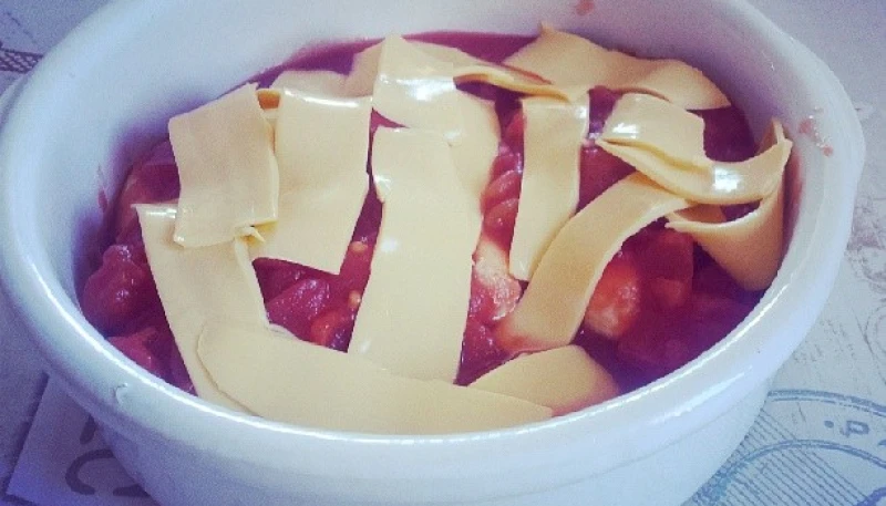 Coupez les tranches de cheddar en lamelles et placez-les sur votre pulpe de tomate.