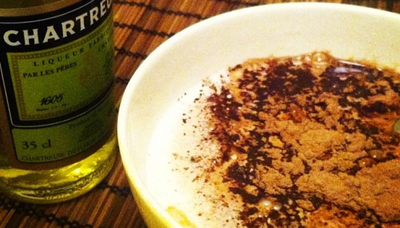 Réalisez un chocolat chaud. Versez-le dans une tasse, ajoutez la chartreuse.