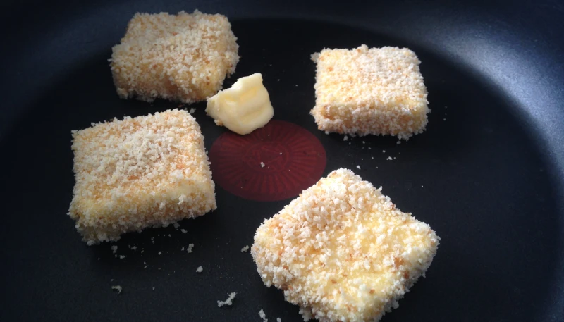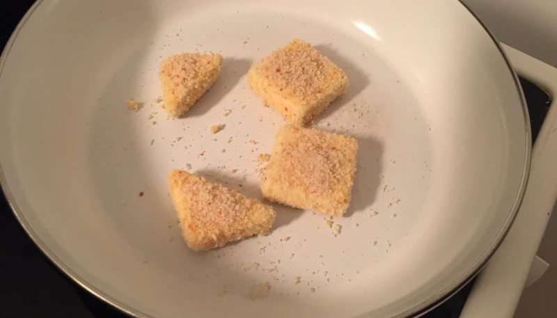 - tremper le kiri dans la farine puis l’œuf puis la chapelure (faire en sorte que tout le kiri soit recouvert de chapelure)