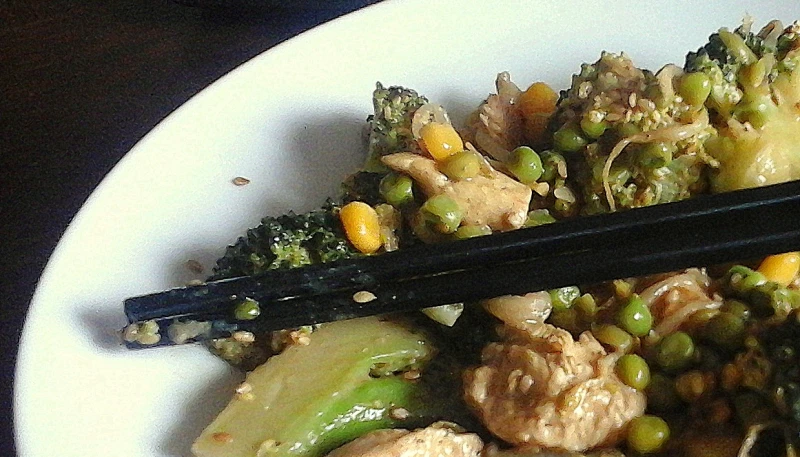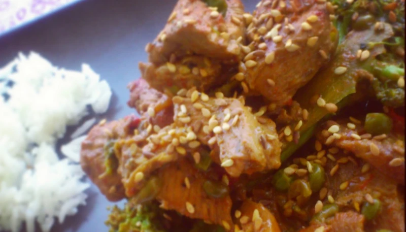 - Lorsque les ingrédients ont une jolie couleur (viande dorée, légumes croquants mais cuits), ajouter une pluie de graine de sésame et la moitié restante de la brique de lait de coco que vous aviez utilisé pour le riz. Pimentez selon votre goût, et mangez chaud !