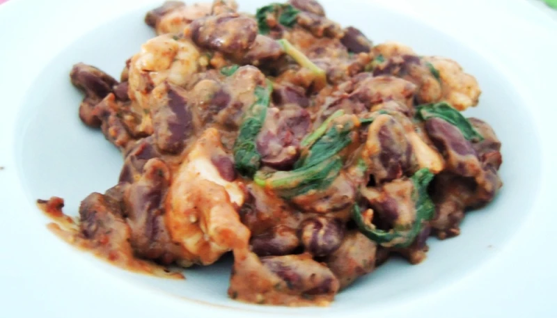 Après quelques minutes ajoutez les haricots rouges avec leur eau, et faîtes chauffer au plus fort pour que les haricots cuisent et que toute l'eau s'évapore. Une fois l'eau évaporée, ajoutez la crème avec le mélange d'épices et faites revenir quelques minutes.