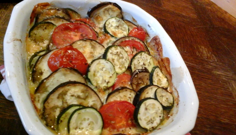 Dans un plat à gratin, peu profond, disposer les tranches des différents ingrédients en les plaçant "debout" et en alternant .