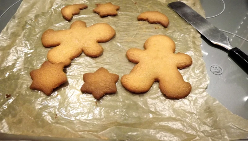 Lorsque votre pâte est prête, placez-la entre deux feuilles de papier sulfurisé et étalez là avec votre rouleau à pâtisserie. Choisissez votre emporte pièce de Noël et faites vos formes de biscuits