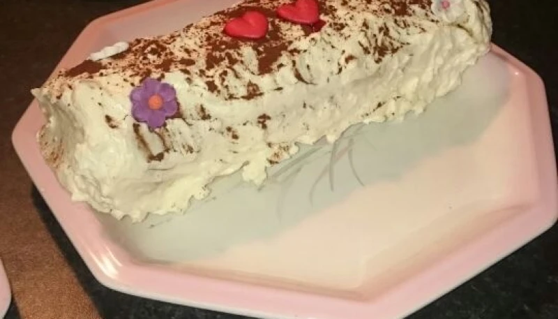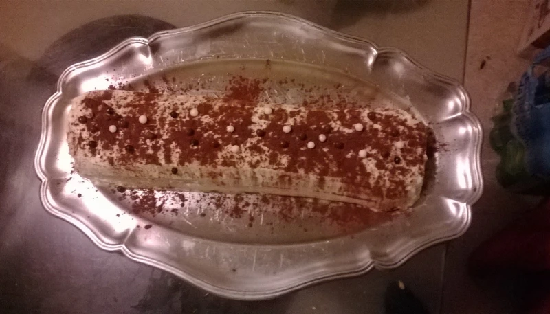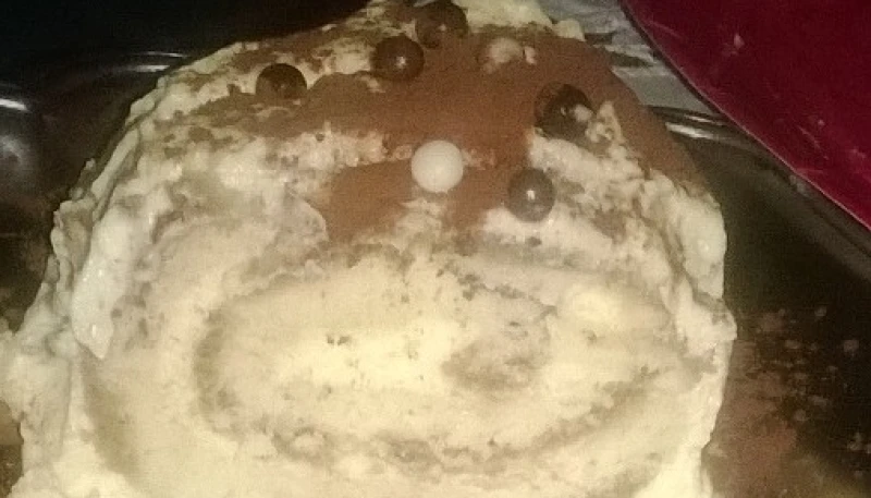 Dérouler le biscuit et l'imbiber légèrement de café. Etaler les 3/4 de la crème sur le biscuit. Rouler le biscuit bien serré dans un film étirable. Réserver au frais pendant 8 heures.