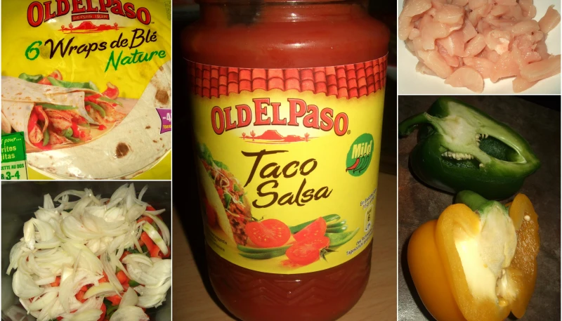 Déposer de la sauce au milieu de la crêpe. Ajouter le poulet, les poivrons et les oignons.