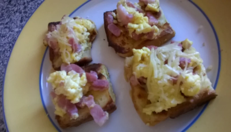 Quand les oeufs brouillés sont cuits ajouter les lardons et servir immédiatement sur les toasts de pain perdu.