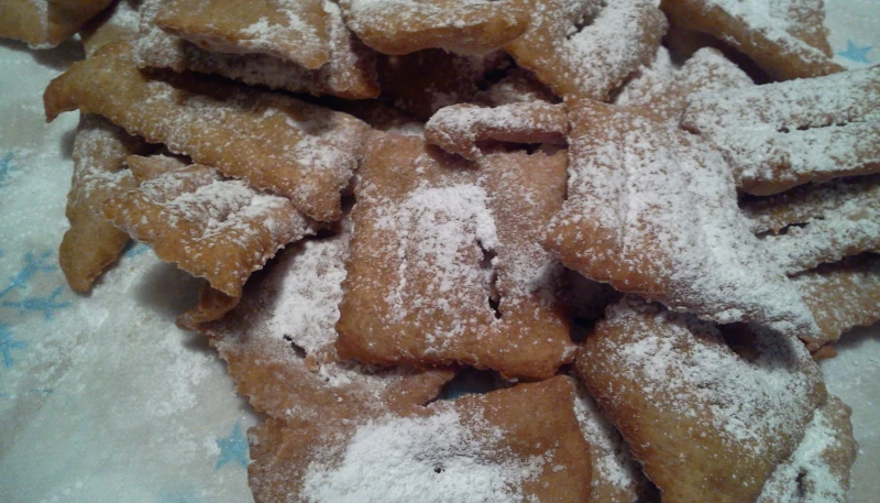 Fariner une planche ou une plaque avec la farine restante, puis étaler la pâte. Faites chauffer de l'huile dans une friteuse ou une casserole puis à l'aide d'un couteau ou d'emporte-pièces, découper la pâte en triangles ou en rectangles en pratiquant une ou plusieurs incisures dans les formes obtenues pour faciliter la cuisson. Plonger les beignets dans l'huile chaude par 3-4 et les laisser 2 min de chaque côté.