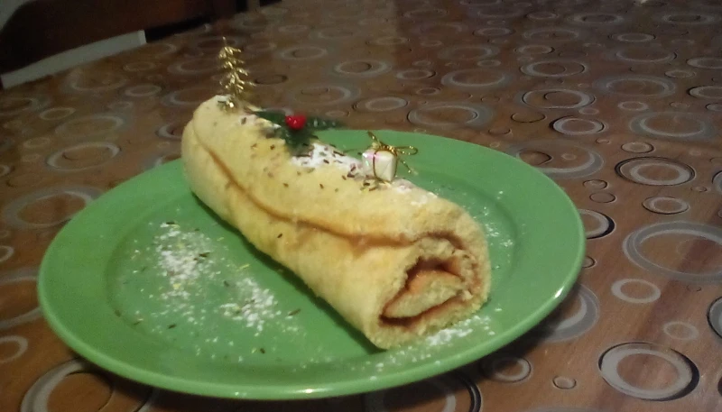 * Une fois froid, dérouler délicatement le biscuit et ôter le papier cuisson. Puis mettez la garniture de votre choix :]