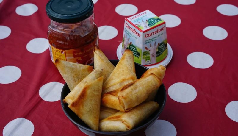 Mélanger le fromage et les tomates confites coupées en morceaux et former les samoussas (voir la technique sur internet).