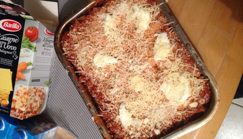 6. Pour la dernière couche: mettre les feuilles de pâtes, et finir par la sauce sans y ajouter de béchamel ni de crème. Et mettre le fromage (assez pour que ça gratine bien) et enfourner à four très chaud, 200°C.