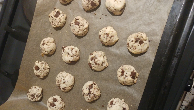 Recouvrir une plaque de papier cuisson. Faire de petites boules de pâte et les aplatir légèrement sur la plaque.