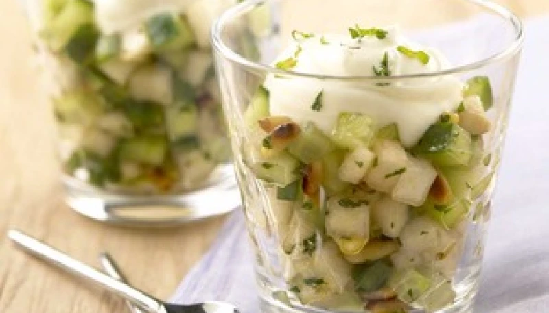 Déposez dans un cul de poule les dés de concombre et de poire, les pignons et les 3/4 de la menthe.