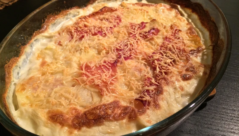 6) Ajoutez ensuite les pommes de terre ainsi que du rapé de gruyère puis mélangez de nouveau.