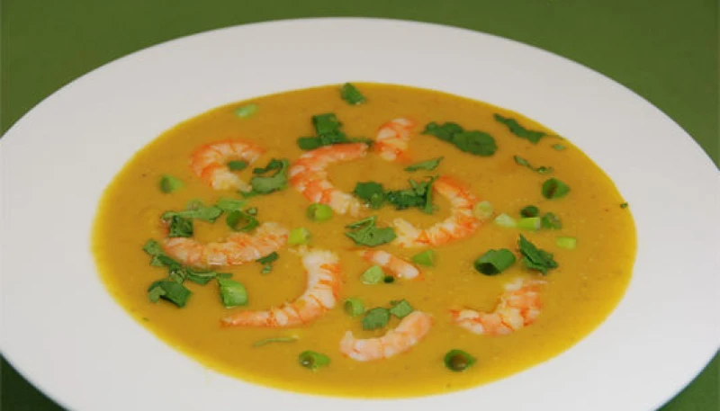 Dans une casserole, faire revenir l'échalote et les crevettes dans un peu d'huile d'olive et ajouter la soupe une fois que les crevettes sont bien rosées.