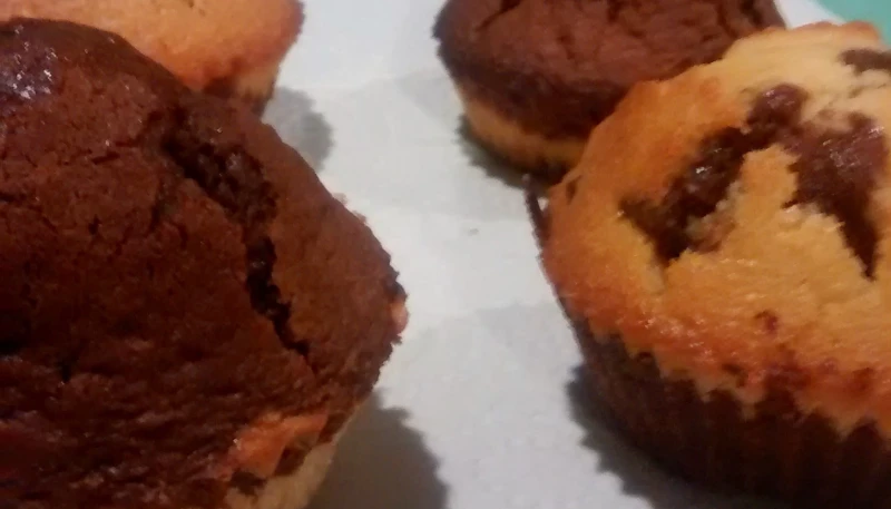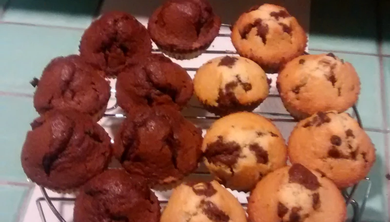 Remplir les moules à moitié avec une des pâtes et finir avec l'autre. Attention à ne pas trop remplir, ça va gonfler ! Vous pouvez vous aider des cuillères à soupes.